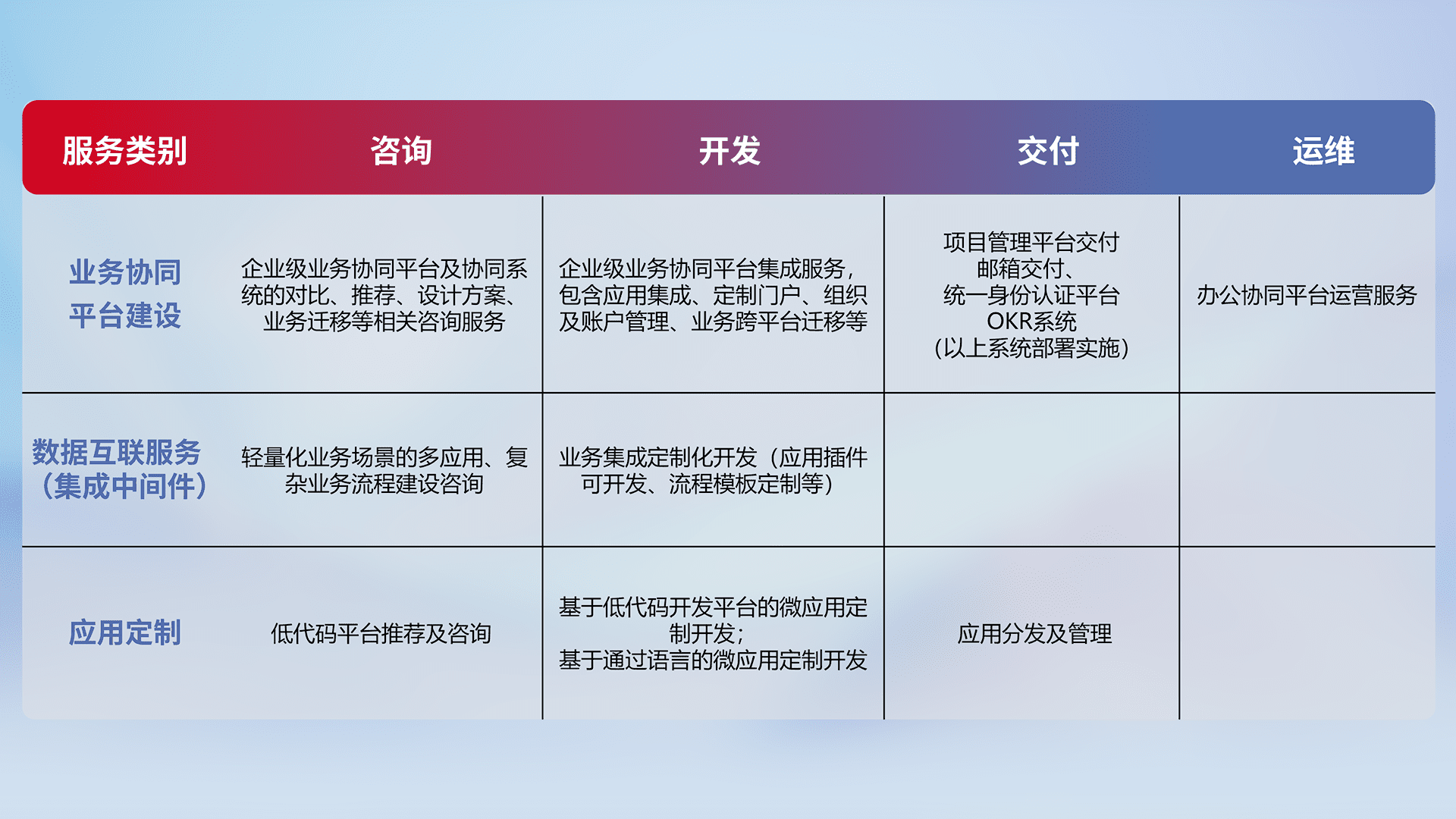 针对钉钉、、、、企微、、、、IDaas等平台级产品提供产品的规划、、方案、、交付、、、定制化开发等服务,,实现如统一协同办公、、智能客户服务、、、、混合会议管理、、、、智能数据查询、、等业务场景,,实现数字化转型。。